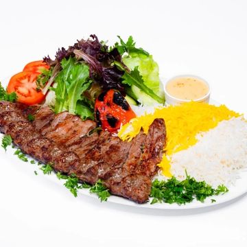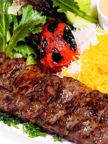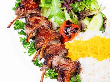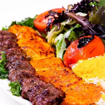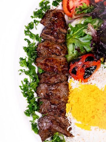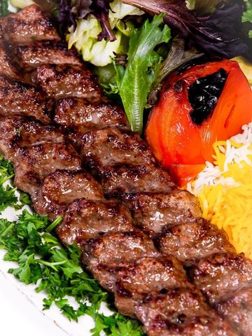 This Combination is A Skewer of Ground Beef & A Skewer of Veal Tenderloin with Basmati Rice and Grilled Tomato