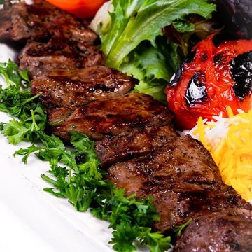 A Skewer of Veal Tenderloin Marinated With Pomegranate Paste, with Basmati Rice and Grilled Tomato