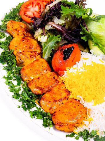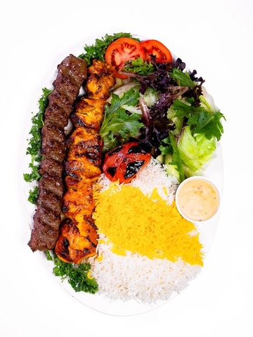 This Combination is A Skewer of Ground Beef & A Skewer of Chicken Breast with Basmati Rice and Grilled Tomato